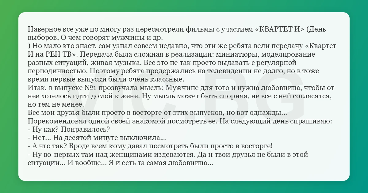 Наверное все уже по многу раз пересмотрели фильмы с участием «КВАРТЕТ И» (День выборов, О чем говорят мужчины и др. ) Но мало кто знает, сам узнал совсем недавно, что эти же ребята вели передачу «Квартет И на РЕН ТВ». Передача была сложная в реализации: миниатюры, моделирование разных ситуаций, живая музыка. Все это не так просто выдавать с регулярной периодичностью. Поэтому ребята продержались на телевидении не долго, но в тоже время первые выпуски были очень классные. Итак, в выпуске №1 прозвучала мысль: Мужчине для того и нужна любовница, чтобы от нее хотелось идти домой к жене. Ну мысль может быть спорная, не все с ней согласятся, но тем не менее. Все мои друзья были просто в восторге от этих выпусков, но вот однажды... Порекомендовал одной своей знакомой посмотреть ее. На следующий день спрашиваю: - Ну как? Понравилось? - Нет... На десятой минуте выключила... - А что так? Вроде всем кому давал посмотреть были просто в восторге! - Ну во-первых там над женщинами издеваются. Да и твои друзья не были в этой ситуации... И вообще… Я и есть та самая любовница...