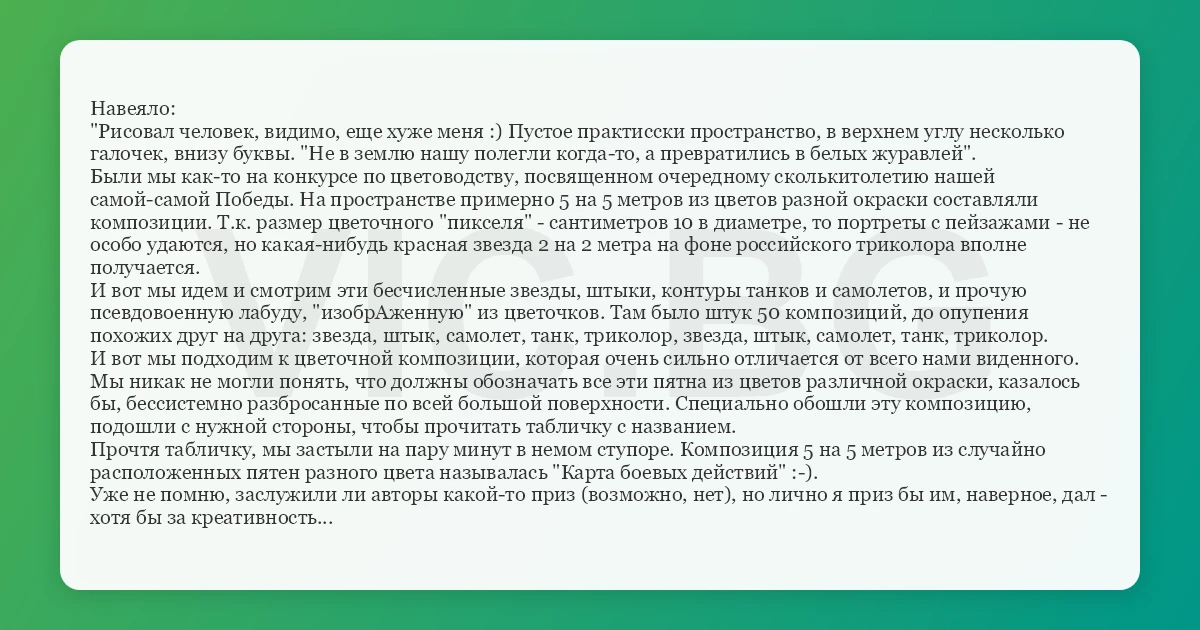 Навеяло: "Рисовал человек, видимо, еще хуже меня :) Пустое практисски пространство, в верхнем углу несколько галочек, внизу буквы. "Не в землю нашу полегли когда-то, а превратились в белых журавлей". Были мы как-то на конкурсе по цветоводству, посвященном очередному сколькитолетию нашей самой-самой Победы. На пространстве примерно 5 на 5 метров из цветов разной окраски составляли композиции. Т.к. размер цветочного "пикселя" - сантиметров 10 в диаметре, то портреты с пейзажами - не особо удаются, но какая-нибудь красная звезда 2 на 2 метра на фоне российского триколора вполне получается. И вот мы идем и смотрим эти бесчисленные звезды, штыки, контуры танков и самолетов, и прочую псевдовоенную лабуду, "изобрАженную" из цветочков. Там было штук 50 композиций, до опупения похожих друг на друга: звезда, штык, самолет, танк, триколор, звезда, штык, самолет, танк, триколор. И вот мы подходим к цветочной композиции, которая очень сильно отличается от всего нами виденного. Мы никак не могли понять, что должны обозначать все эти пятна из цветов различной окраски, казалось бы, бессистемно разбросанные по всей большой поверхности. Специально обошли эту композицию, подошли с нужной стороны, чтобы прочитать табличку с названием. Прочтя табличку, мы застыли на пару минут в немом ступоре. Композиция 5 на 5 метров из случайно расположенных пятен разного цвета называлась "Карта боевых действий" :-). Уже не помню, заслужили ли авторы какой-то приз (возможно, нет), но лично я приз бы им, наверное, дал - хотя бы за креативность...