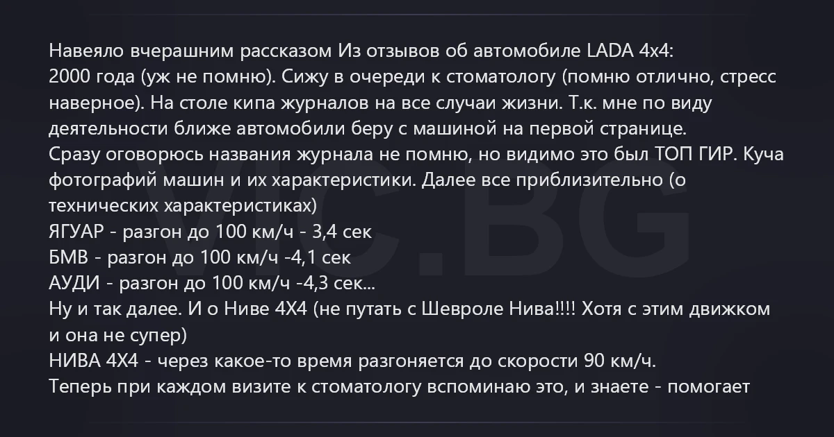 Навеяло вчерашним рассказом Из отзывов об автомобиле LADA 4х4: 2000 года (уж не помню). Сижу в очереди к стоматологу (помню отлично, стресс наверное). На столе кипа журналов на все случаи жизни. Т.к. мне по виду деятельности ближе автомобили беру с машиной на первой странице. Сразу оговорюсь названия журнала не помню, но видимо это был ТОП ГИР. Куча фотографий машин и их характеристики. Далее все приблизительно (о технических характеристиках) ЯГУАР - разгон до 100 км/ч - 3,4 сек БМВ - разгон до 100 км/ч -4,1 сек АУДИ - разгон до 100 км/ч -4,3 сек... Ну и так далее. И о Ниве 4Х4 (не путать с Шевроле Нива!!!! Хотя с этим движком и она не супер) НИВА 4Х4 - через какое-то время разгоняется до скорости 90 км/ч. Теперь при каждом визите к стоматологу вспоминаю это, и знаете - помогает