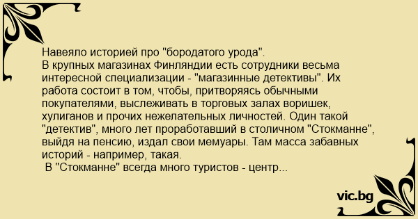 В крупных магазинах Финляндии есть сотрудники весьма интересной специализации - "магазинные детективы". Их работа состоит в том, чтобы, притворяясь обычными покупателями, выслеживать в торговых залах воришек, хулиганов и прочих нежелательных личностей. Один такой "детектив", много лет проработавший в столичном "Стокманне", выйдя на пенсию, издал свои мемуары. Там масса забавных историй - например, такая.