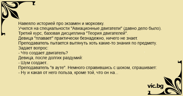 Навеяло историей про экзамен и морковку. Учился на специальности "Авиационные двигатели" (давно дело было). Третий курс, базовая дисциплина "Теория двигателей". Девица "плавает" практически безнадежно, ничего не знает. Преподаватель пытается вытянуть хоть какие-то знания по предмету. Задает вопрос: - Что создает двигатель? Девица, после долгих раздумий: - Шум создает.. Преподаватель "в ауте". Немного справившись с шоком, спрашивает: - Ну и какая от него польза, кроме той, что он на аэродроме своим шумом ворон пугает? А в ответ - тишина.. Немного повздыхав, преподаватель говорит: "Тягу он создает, тягу.." и ставит ей "уд." Когда она вышла из аудитории, он задумчиво смотрит на дверь и говорит: "Как же она доучилась до третьего курса?!!!". P.S. А девица доучилась до диплома, защитила его и работала почти по специальности: в отделе переводов на моторостроительном заводе. кстати, английского она тоже не знала.
