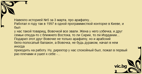 Навеяло историей №5 за 3 марта, про арафатку... Работал я году так в 1997 в одной программисткой конторке в Киеве, и был у нас такой товарищ, Вовочкой все звали. Жена у него узбечка, и друг семьи откуда-то с ближнего Востока, то ли Сирии, то ли Иордании... Подарил этот друг Вовочке не только арафатку, но и арабский бело-полосатый балахон, а Вовочка, не будь дураком, начал в нем иногда приходить на работу. Ну, директор у нас спокойный был, пожал в первый раз плечами и ушел к себе - работе не мешает. Мы тоже немного потешились и привыкли. Апофеоз наступил, когда в Киеве проходила какая-то компьютерная выставка. Computerworld-Киев напечатал фотографию нашего героя у выставочного стенда (как был одет Вовочка, уточнять не буду) с комментарием: "Друзья с Ближнего Востока тоже интересуются компьютерными технологиями".