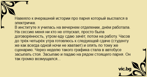 Навеяло к вчерашней истории про парня который выспался в электричке. В институте я училась на вечернем отделении, днём работала. На сессию меня ни кто не отпускал, просто была договорённость, утром еду сдаю зачёт, потом на работу. Часов до трёх-четырёх утра готовлюсь к следующей сдаче (студенту же как всегда одной ночи не хватает) и опять по тому же сценарию. Через неделю такого графика стала в автобусе засыпать стоя. Засыпаю и падаю на рядом стоящего парня. Он так громко возмущался -"Девушка, ну сколько можно!" Вижу место освободилось, я запрыгнула, дальше не помню, вырубилась сразу. Просыпаюсь от того, что будят на конечной остановке. А мне так удобно. Глаза открываю, а рубашка та же. Не знаю почему мне было стыдно, я даже не взглянула в лицо своей "подушке", но розовую рубашку запомнила на всю жизнь.