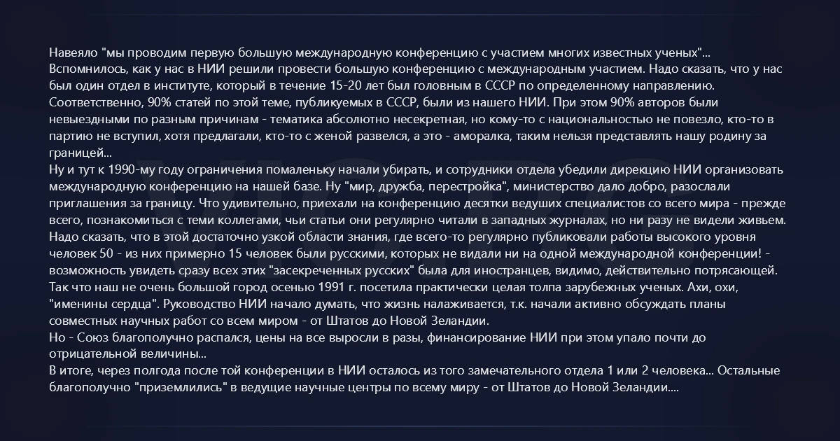 Навеяло "мы проводим первую большую международную конференцию с участием многих известных ученых"... Вспомнилось, как у нас в НИИ решили провести большую конференцию с международным участием. Надо сказать, что у нас был один отдел в институте, который в течение 15-20 лет был головным в СССР по определенному направлению. Соответственно, 90% статей по этой теме, публикуемых в СССР, были из нашего НИИ. При этом 90% авторов были невыездными по разным причинам - тематика абсолютно несекретная, но кому-то с национальностью не повезло, кто-то в партию не вступил, хотя предлагали, кто-то с женой развелся, а это - аморалка, таким нельзя представлять нашу родину за границей... Ну и тут к 1990-му году ограничения помаленьку начали убирать, и сотрудники отдела убедили дирекцию НИИ организовать международную конференцию на нашей базе. Ну "мир, дружба, перестройка", министерство дало добро, разослали приглашения за границу. Что удивительно, приехали на конференцию десятки ведуших специалистов со всего мира - прежде всего, познакомиться с теми коллегами, чьи статьи они регулярно читали в западных журналах, но ни разу не видели живьем. Надо сказать, что в этой достаточно узкой области знания, где всего-то регулярно публиковали работы высокого уровня человек 50 - из них примерно 15 человек были русскими, которых не видали ни на одной международной конференции! - возможность увидеть сразу всех этих "засекреченных русских" была для иностранцев, видимо, действительно потрясающей. Так что наш не очень большой город осенью 1991 г. посетила практически целая толпа зарубежных ученых. Ахи, охи, "именины сердца". Руководство НИИ начало думать, что жизнь налаживается, т.к. начали активно обсуждать планы совместных научных работ со всем миром - от Штатов до Новой Зеландии. Но - Союз благополучно распался, цены на все выросли в разы, финансирование НИИ при этом упало почти до отрицательной величины... В итоге, через полгода после той конференции в НИИ осталось из того замечательного отдела 1 или 2 человека... Остальные благополучно "приземлились" в ведущие научные центры по всему миру - от Штатов до Новой Зеландии. Так всего лишь за полгода у нас в стране исчезло целое научное направление. Практически, как корова языком...
