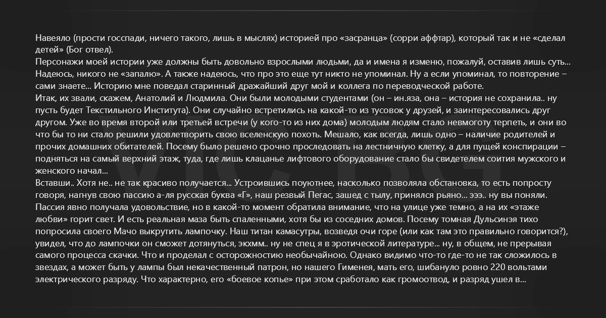 Навеяло (прости госспади, ничего такого, лишь в мыслях) историей про «засранца» (сорри аффтар), который так и не «сделал детей» (Бог отвел). Персонажи моей истории уже должны быть довольно взрослыми людьми, да и имена я изменю, пожалуй, оставив лишь суть... Надеюсь, никого не «запалю». А также надеюсь, что про это еще тут никто не упоминал. Ну а если упоминал, то повторение – сами знаете... Историю мне поведал старинный дражайший друг мой и коллега по переводческой работе. Итак, их звали, скажем, Анатолий и Людмила. Они были молодыми студентами (он – ин.яза, она – история не сохранила.. ну пусть будет Текстильного Института). Они случайно встретились на какой-то из тусовок у друзей, и заинтересовались друг другом. Уже во время второй или третьей встречи (у кого-то из них дома) молодым людям стало невмоготу терпеть, и они во что бы то ни стало решили удовлетворить свою вселенскую похоть. Мешало, как всегда, лишь одно – наличие родителей и прочих домашних обитателей. Посему было решено срочно проследовать на лестничную клетку, а для пущей конспирации – подняться на самый верхний этаж, туда, где лишь клацанье лифтового оборудование стало бы свидетелем соития мужского и женского начал... Вставши.. Хотя не.. не так красиво получается... Устроившись поуютнее, насколько позволяла обстановка, то есть попросту говоря, нагнув свою пассию а-ля русская буква «Г», наш резвый Пегас, зашед с тылу, принялся рьяно... эээ.. ну вы поняли. Пассия явно получала удовольствие, но в какой-то момент обратила внимание, что на улице уже темно, а на их «этаже любви» горит свет. И есть реальная маза быть спаленными, хотя бы из соседних домов. Посему томная Дульсинэя тихо попросила своего Мачо выкрутить лампочку. Наш титан камасутры, возведя очи горе (или как там это правильно говорится?), увидел, что до лампочки он сможет дотянуться, экхмм.. ну не спец я в эротической литературе... ну, в общем, не прерывая самого процесса скачки. Что и проделал с осторожностию необычайною. Однако видимо что-то где-то не так сложилось в звездах, а может быть у лампы был некачественный патрон, но нашего Гименея, мать его, шибануло ровно 220 вольтами электрического разряду. Что характерно, его «боевое копье» при этом сработало как громоотвод, и разряд ушел в Дульсинею. Отчего та, получив те же 220... ну может и чутка поменьше.. кароче, отведав нехилого электрошока прямо в свою разгоряченную «бархатную пещеру», наша героиня непроизвольно расслабила гладкую мускулатуру сфинктерной части своего прекрасного (нисколько, кстати, в этом не сомневаюсь) задка, ну и далее вы уже наверное догадались. Несмотря на электроразряд, наш герой-любовник тут же «поник головой», ибо по его бедрам спереди, и чуть ниже, по штанам, «полилось теплое, твердо-жидкой фракции»... Слава Богу, у «янь» не случился типичный для таких ситуаций «клин», ибо их в таком виде не приняла бы ни одна скорая помощь или больница. Ну, в общем, как-то расстыковались наши «Союз» и «Аполлон», как они там оттирались – история умалчивает. С того дня больше и не общались. Стыдно и той и другой стороне было, чо уж. И ведь вот это все, что я вам рассказал – это ведь еще только пре-амбула. По старинной 15-летней традиции, получайте Амбулу: Через несколько месяцев (может через 3, а может и через 6, не суть важно), прекрасная половина нашего рассказа все же развспоминалась, зано