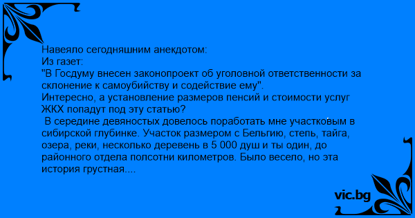 В середине девяностых довелось поработать мне участковым в сибирской глубинке. Участок размером с Бельгию, степь, тайга, озера, реки, несколько деревень в 5 000 душ и ты один, до районного отдела полсотни километров. Было весело, но эта история грустная. Как-то в марте поутру постучался ко мне в кабинет мужичок и поведал, что соседка его бабка Шулепиха второй день не показывается, на стук в дверь не отзывается и печь у нее не топится. Последний аргумент был более чем серьезен и мы не мешкая отправились к дому старушки. Старенькая дверь, запертая изнутри подалась под нашим нажимом и в выстывшей квартире на кухне мы увидели Шулепину Анну Никаноровну 1926 года рождения висящую под потолочной балкой в петле из бельевой веревки. Полагающийся осмотр места происшествия показал полное отсутствие признаков насильственной смерти и несмотря на то, что не было обычной в таких случаях предсмертной записки все указывало на самоубийство. А на причину самоубийства указывало то, что в доме из съедобного было только полстакана соли. Ни крошки хлеба, ни единой картофелины. Казалось бы, как такое возможно в деревне? Возможно. В тот год весь август и сентябрь шли затяжные дожди и огород старушки размером в сотку превратился в сплошную лужу, сгнило все что и вырасти не успело. Анна Никаноровна среди соседей слыла опрятной и беззлобной, никогда ни о чем не жалилась, жила одна, единственный сын много лет уж как сгинул где-то без вести и на похоронах не объявился. А свою небольшую пенсию которой худо-бедно хватило бы на какую-то еду на момент события она не получала 9-й месяц по причине отсутствия средств в пенсионном фонде. Обычная по тем временам история. Все соседи сокрушались: "Да как же так! Да разве же мы б не помогли если б знали!" Конечно помогли бы. Да вот не знали.