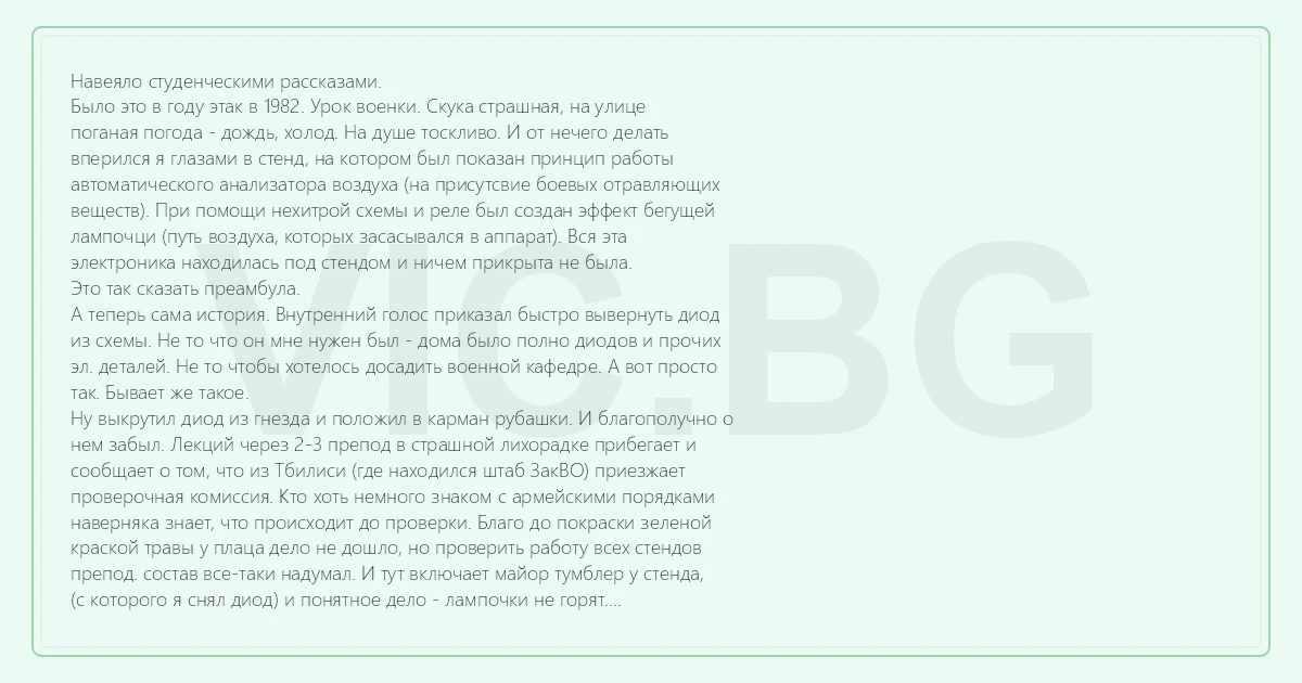 Навеяло студенческими рассказами. Было это в году этак в 1982. Урок военки. Скука страшная, на улице поганая погода - дождь, холод. На душе тоскливо. И от нечего делать вперился я глазами в стенд, на котором был показан принцип работы автоматического анализатора воздуха (на присутсвие боевых отравляющих веществ). При помощи нехитрой схемы и реле был создан эффект бегущей лампочци (путь воздуха, которых засасывался в аппарат). Вся эта электроника находилась под стендом и ничем прикрыта не была. Это так сказать преамбула. А теперь сама история. Внутренний голос приказал быстро вывернуть диод из схемы. Не то что он мне нужен был - дома было полно диодов и прочих эл. деталей. Не то чтобы хотелось досадить военной кафедре. А вот просто так. Бывает же такое. Ну выкрутил диод из гнезда и положил в карман рубашки. И благополучно о нем забыл. Лекций через 2-3 препод в страшной лихорадке прибегает и сообщает о том, что из Тбилиси (где находился штаб ЗакВО) приезжает проверочная комиссия. Кто хоть немного знаком с армейскими порядками наверняка знает, что происходит до проверки. Благо до покраски зеленой краской травы у плаца дело не дошло, но проверить работу всех стендов препод. состав все-таки надумал. И тут включает майор тумблер у стенда, (с которого я снял диод) и понятное дело - лампочки не горят. Тут пошла ругань в адрес дашнаков, мусаватистов, врагов Родины итд. Но ругань руганью, а стенд-то не работает! И тут препод обращается ко мне (как к единственному химику, разбирающегося в электронике) и просит - "срочно надо починить! Даю один отгул!" Что такое один отгул обьяснять студентам не надо. Отвечаю - "надо домой поехать, посмотреть детальку" Майор - "быстро, и чтоб до конца дня лампы горели!". Иду вразвалочку домой, сытно кушаю, возращаюсь на военную кафедру (на другом конце города, ставлю диод на свое место и демонстрирую работу стенда... Похвалы итд. Вся группа (которой я рассказал как обстоит дело) в осадке... О том что зачет в тот семестр я получил мгновенно и без всяких вопросов упомянуть стоит. Мораль - иногда надо прислушиваться к внутреннему голосу.