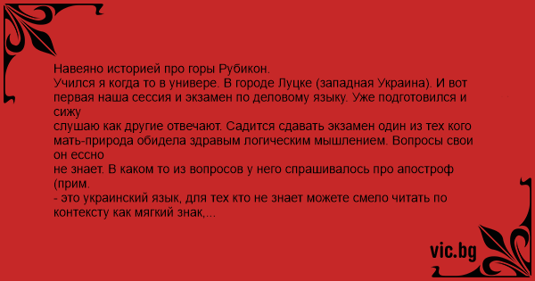 Навеяно историей про горы Рубикон. Учился я когда то в универе. В городе Луцке (западная Украина). И вот первая наша сессия и экзамен по деловому языку. Уже подготовился и сижу слушаю как другие отвечают. Садится сдавать экзамен один из тех кого мать-природа обидела здравым логическим мышлением. Вопросы свои он ессно не знает. В каком то из вопросов у него спрашивалось про апостроф (прим. - это украинский язык, для тех кто не знает можете смело читать по контексту как мягкий знак, смысл истории не изменится). Так вот. На вопросы для чего нужен апостроф, что он передает и. т. д. парень не отвечает и упорно молчит. Преподавательница желая вытянуть у него хоть какие то знания спрашивает "Где в слове может стоять апостроф?" На что крендель подумав секунд 20 выдает "В начале слова!!!". По аудитории смех. Она предлагает ему назвать хоть одно такое слово и 3 балла ему гарантированы. Через минуты 2-3 он с горечью признает что "НЕ ПОМНИТ ЭТИХ СЛОВ". В аудитории к этому моменту уже никто не готовился к экзамену, все слушали бесплатный концерт и угорали со смеху. И тут препода делает контрольный выстрел "А как хоть пишется апостроф ты знаешь?". После ответа мы в чувство приходили минут 10. А ответ был прост "С большой буквы". З. Ы. Привет матфаку ВДУ.