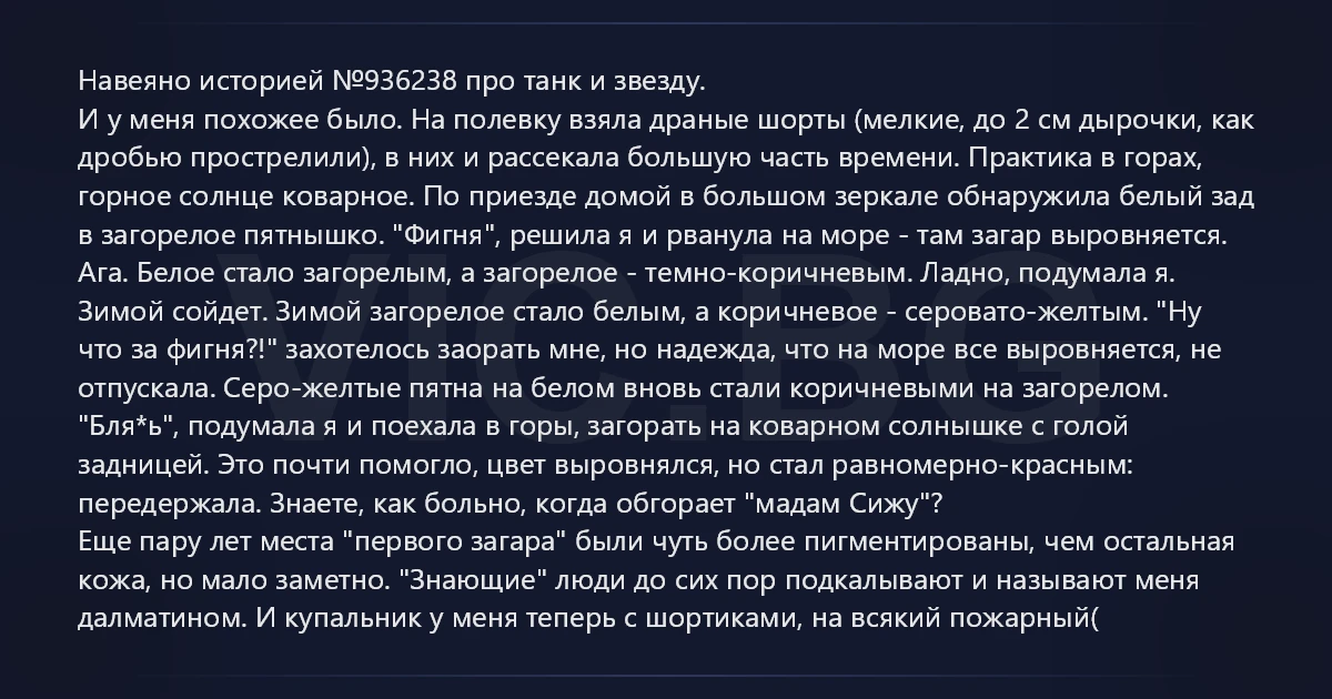 И у меня похожее было. На полевку взяла драные шорты (мелкие, до 2 см дырочки, как дробью прострелили), в них и рассекала большую часть времени. Практика в горах, горное солнце коварное. По приезде домой в большом зеркале обнаружила белый зад в загорелое пятнышко. "Фигня", решила я и рванула на море - там загар выровняется. Ага. Белое стало загорелым, а загорелое - темно-коричневым. Ладно, подумала я. Зимой сойдет. Зимой загорелое стало белым, а коричневое - серовато-желтым. "Ну что за фигня?!" захотелось заорать мне, но надежда, что на море все выровняется, не отпускала. Серо-желтые пятна на белом вновь стали коричневыми на загорелом. "Бля*ь", подумала я и поехала в горы, загорать на коварном солнышке с голой задницей. Это почти помогло, цвет выровнялся, но стал равномерно-красным: передержала. Знаете, как больно, когда обгорает "мадам Сижу"?