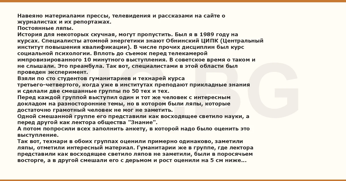 Навеяно материалами прессы, телевидения и рассказами на сайте о журналистах и их репортажах. Постоянные ляпы. История для некоторых скучная, могут пропустить. Был я в 1989 году на курсах. Специалисты атомной энергетики знают Обнинский ЦИПК (Центральный институт повышения квалификации). В числе прочих дисциплин был курс социальной психологии. Вплоть до съемок перед телекамерой импровизированного 10 минутного выступления. В советское время о таком и не слышали. Это преамбула. Так вот, специалистами в этой области был проведен эксперимент. Взяли по сто студентов гуманитариев и технарей курса третьего-четвертого, когда уже в институтах преподают прикладные знания и сделали две смешанные группы по 50 тех и тех. Перед каждой группой выступил один и тот же человек с интересным докладом на разносторонние темы, но в котором были ляпы, которые достаточно грамотный человек не мог не заметить. Одной смешанной группе его представили как восходящее светило науки, а перед другой как лектора общества "Знание". А потом попросили всех заполнить анкету, в которой надо было оценить это выступление. Так вот, технари в обоих группах оценили примерно одинаково, заметили ляпы, отметили интересный материал. Гуманитарии же в группе, где лектора представили как восходящее светило ляпов не заметили, были в поросячьем восторге, а в другой смешали его с дерьмом и рост оценили на 5 см ниже фактического. Субъективизм сумасшедший. Вот она - четвертая власть.