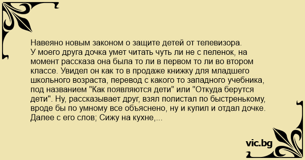 У моего друга дочка умет читать чуть ли не с пеленок, на момент рассказа она была то ли в первом то ли во втором классе. Увидел он как то в продаже книжку для младшего школьного возраста, перевод с какого то западного учебника, под названием "Как появляются дети" или "Откуда берутся дети". Ну, рассказывает друг, взял полистал по быстренькому, вроде бы по умному все объяснено, ну и купил и отдал дочке. Далее с его слов; Сижу на кухне, попиваю кофеек, одним глазом в телевизор, другим в журнал. Тут заходит заходит доча (Д) с этой книжкой и с ходу задает вопрос:
