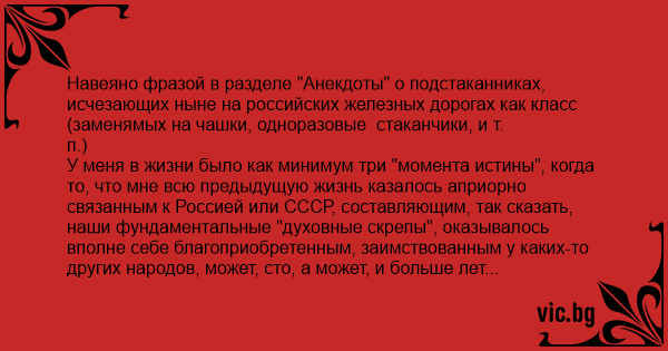 У меня в жизни было как минимум три "момента истины", когда то, что мне всю предыдущую жизнь казалось априорно связанным к Россией или СССР, составляющим, так сказать, наши фундаментальные "духовные скрепы", оказывалось вполне себе благоприобретенным, заимствованным у каких-то других народов, может, сто, а может, и больше лет тому назад. Причем сам факт заимствования уже давно был всеми позабыт.