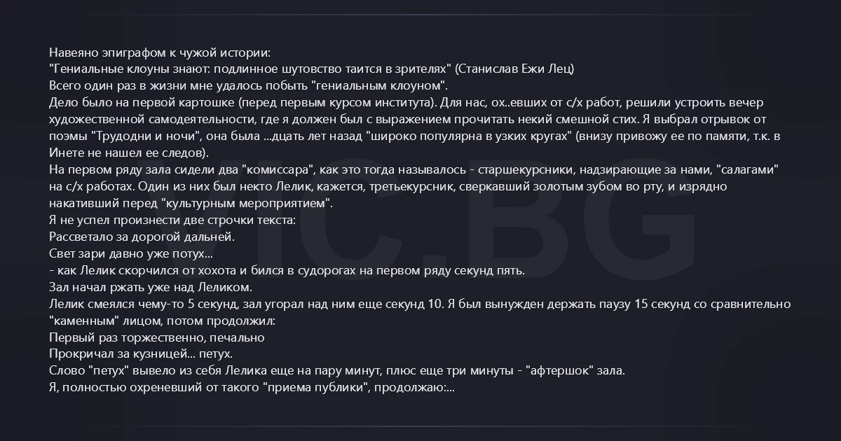 Лелик смеялся чему-то 5 секунд, зал угорал над ним еще секунд 10. Я был вынужден держать паузу 15 секунд со сравнительно "каменным" лицом, потом продолжил: