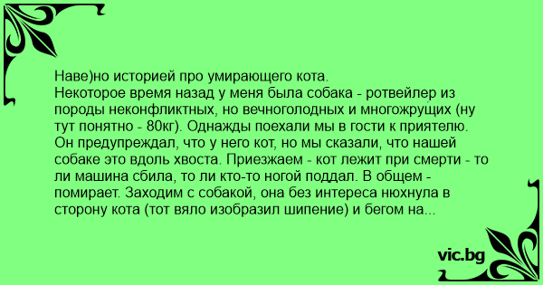 Некоторое время назад у меня была собака - ротвейлер из породы неконфликтных, но вечноголодных и многожрущих (ну тут понятно - 80кг). Однажды поехали мы в гости к приятелю. Он предупреждал, что у него кот, но мы сказали, что нашей собаке это вдоль хвоста. Приезжаем - кот лежит при смерти - то ли машина сбила, то ли кто-то ногой поддал. В общем - помирает. Заходим с собакой, она без интереса нюхнула в сторону кота (тот вяло изобразил шипение) и бегом на кухню к котовой миске. Два хряп-хряп и собака сидит возле хозяйки, которая режет салат, и преданно смотрит ей в глаза. Кот охренел - непонятная дурмашина занимает его исконное место! Ползком добрался до миски, потребовал еды и храбро оборонял ее (я говорил - собака абсолютно неконфликтная, хотя слюни пускала). В итоге на следующий день, когда мы уезжали, кот вовсю шипел на собаку, носился по квартире и вообще был при охране имущества. Он прожил до достаточно солидного возраста, хотя мою собаку, которая его вылечила, надух не переносил.