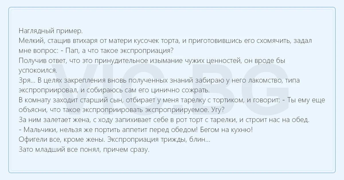 Наглядный пример. Мелкий, стащив втихаря от матери кусочек торта, и приготовившись его схомячить, задал мне вопрос: - Пап, а что такое экспроприация? Получив ответ, что это принудительное изымание чужих ценностей, он вроде бы успокоился. Зря... В целях закрепления вновь полученных знаний забираю у него лакомство, типа экспроприировал, и собираюсь сам его цинично сожрать. В комнату заходит старший сын, отбирает у меня тарелку с тортиком, и говорит: - Ты ему еще объясни, что такое экспроприировать экспроприируемое. Угу? За ним залетает жена, с ходу запихивает себе в рот торт с тарелки, и строит нас на обед. - Мальчики, нельзя же портить аппетит перед обедом! Бегом на кухню! Офигели все, кроме жены. Экспроприация трижды, блин... Зато младший все понял, причем сразу.