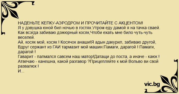 НАДЕНЬТЕ КЕПКУ-АЭРОДРОМ И ПРОЧИТАЙТЕ С АКЦЕНТОМ! Я у дэвушка юной бил ночью в гостях.Утром еду дамой я на тачка сваей. Как всэгда забиваю дэжюрный косяк,Чтоби ехать мне било чуть-чуть веселей. Ай, косяк мой, косяк ! Косячок анаши!Я адын дакурил, забиваю другой, Вдруг сержант из ГАИ тармазит мой машин:Памаги, дарагой ! Памаги, дарагой ! Гаварит - палмался савсем наш матор!Датащи до поста, а иначе - каюк ! Атвечаю - канешна, какой разгавор ?Прицепляйте к мой Вольво ви свой развалюх ! И они прицепились ко мне, ишаки !Пятьдесят километров мой Вольво пошел. И уже перестал я считать косяки.Ай, кумар харашо ! Ай, кумар харашо!!! И когда у мине замутился мазги,Я о дэвушка вспомнил, о мой красате ! Оглянулся назад - о, Аллах, памаги ! Вай, менты на хвасте ! Вай, менты на хвасте !!! Я прибавил газку, но они не отстал.Значит - точно за мною пагоня спишат! И я скорость уже догоняю до ста.И с сабой у мине килограмм анаша !!! А они все за мной, вай, какой паразит!Неужели у них больше мощность движка ? И уже в микрофон мне кричат - ТАРМАЗИ !!!И включают мигалка (на ста сорока). Все к абочина жмутся у нас на пути.Я сто семдесят выжал и понял - баран ! Так же ведь никогда мне от них не уйти,Я папробую их заматать по дворам ! И шарахался в стороны с визгом народ,Вай, какие вадитель в милиций пашли ! Раз пятьсот не вписались они в паварот,Все падъезды, заборы и урны снесли. И отстали они на четвертом часу.Вай, каво захатэли дагнать по дворам ? Я косяк забиваю, машин тармажу,Вихажу из салона сменить номера. Вдруг смотрю - что такое ? Как будто би хвост У машина моей вирастал из зада. Присмотрелся получше - да это же трос ! Ржавый бампер на нем, вай, какая беда !!! И надолго прощай, мой радимый кишлак. Здравствуй, северный город, небольшой Воркута! Здравствуй черствый сухарь и халодный барак. Вот и дэлай дабро этим подлым ментам !!!!