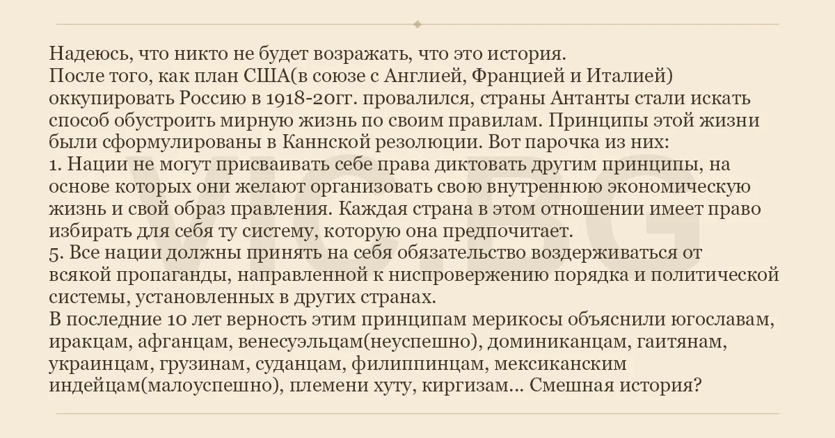 Надеюсь, что никто не будет возражать, что это история. После того, как план США(в союзе с Англией, Францией и Италией) оккупировать Россию в 1918-20гг. провалился, страны Антанты стали искать способ обустроить мирную жизнь по своим правилам. Принципы этой жизни были сформулированы в Каннской резолюции. Вот парочка из них: 1. Нации не могут присваивать себе права диктовать другим принципы, на основе которых они желают организовать свою внутреннюю экономическую жизнь и свой образ правления. Каждая страна в этом отношении имеет право избирать для себя ту систему, которую она предпочитает. 5. Все нации должны принять на себя обязательство воздерживаться от всякой пропаганды, направленной к ниспровержению порядка и политической системы, установленных в других странах. В последние 10 лет верность этим принципам мерикосы объяснили югославам, иракцам, афганцам, венесуэльцам(неуспешно), доминиканцам, гаитянам, украинцам, грузинам, суданцам, филиппинцам, мексиканским индейцам(малоуспешно), племени хуту, киргизам... Смешная история?