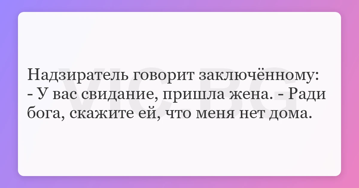 Надзиратель говорит заключённому: - У вас свидание, пришла жена. - Ради бога, скажите ей, что меня нет дома.