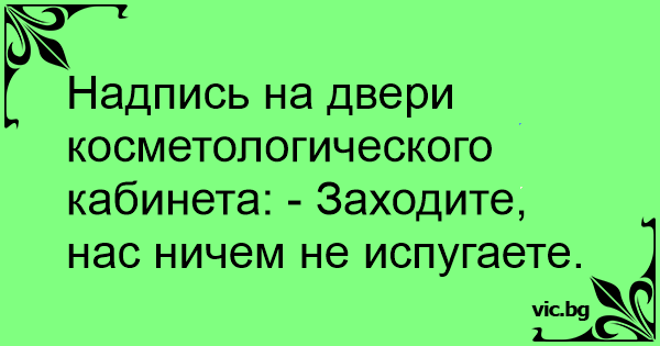 Надпись на двери косметологического кабинета: - Заходите, нас ничем не испугаете.