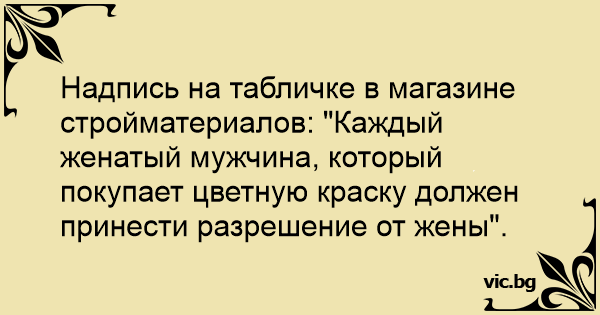 Надпись на табличке в магазине стройматериалов: "Каждый женатый мужчина, который покупает цветную краску должен принести разрешение от жены".