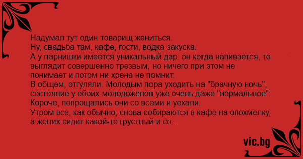 Утром все, как обычно, снова собираются в кафе на опохмелку, а жених сидит какой-то грустный и со здоровенным фингалом. Естественно, посыпались вопросы: типа, кто, что, почему, за что?