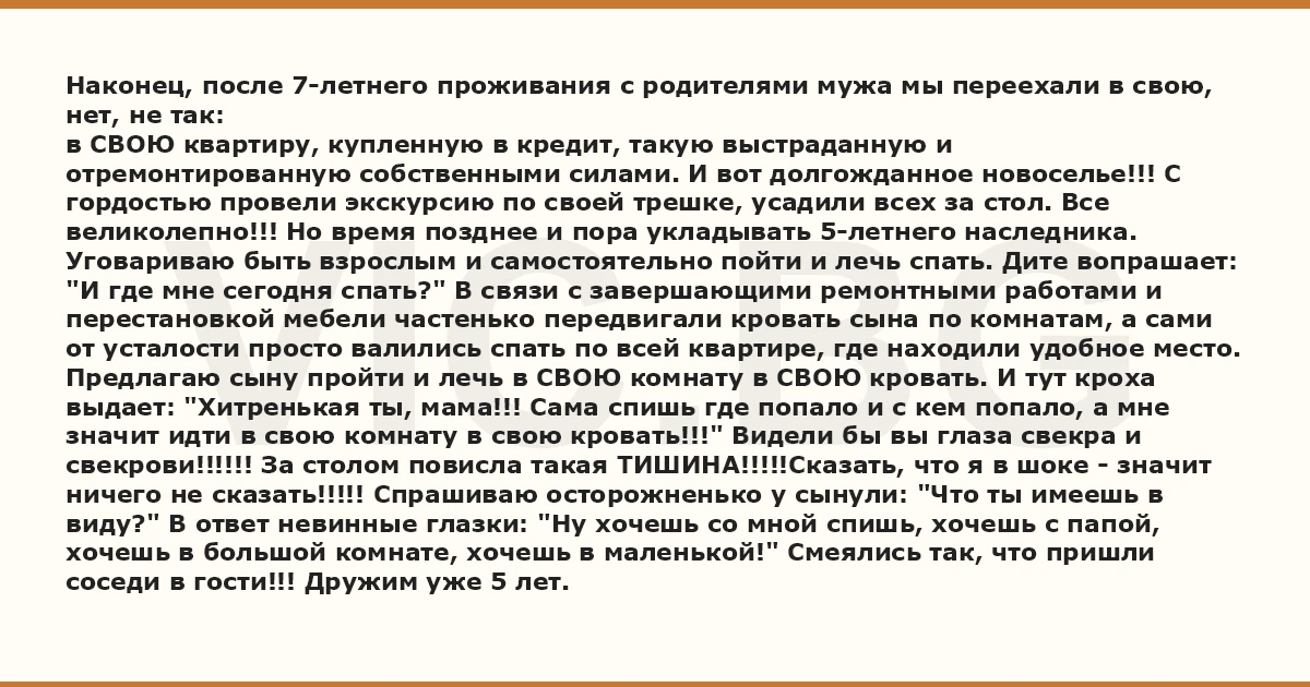 в СВОЮ квартиру, купленную в кредит, такую выстраданную и отремонтированную собственными силами. И вот долгожданное новоселье!!! С гордостью провели экскурсию по своей трешке, усадили всех за стол. Все великолепно!!! Но время позднее и пора укладывать 5-летнего наследника. Уговариваю быть взрослым и самостоятельно пойти и лечь спать. Дите вопрашает: "И где мне сегодня спать?" В связи с завершающими ремонтными работами и перестановкой мебели частенько передвигали кровать сына по комнатам, а сами от усталости просто валились спать по всей квартире, где находили удобное место. Предлагаю сыну пройти и лечь в СВОЮ комнату в СВОЮ кровать. И тут кроха выдает: "Хитренькая ты, мама!!! Сама спишь где попало и с кем попало, а мне значит идти в свою комнату в свою кровать!!!" Видели бы вы глаза свекра и свекрови!!!!!! За столом повисла такая ТИШИНА!!!!!Сказать, что я в шоке - значит ничего не сказать!!!!! Спрашиваю осторожненько у сынули: "Что ты имеешь в виду?" В ответ невинные глазки: "Ну хочешь со мной спишь, хочешь с папой, хочешь в большой комнате, хочешь в маленькой!" Смеялись так, что пришли соседи в гости!!! Дружим уже 5 лет.