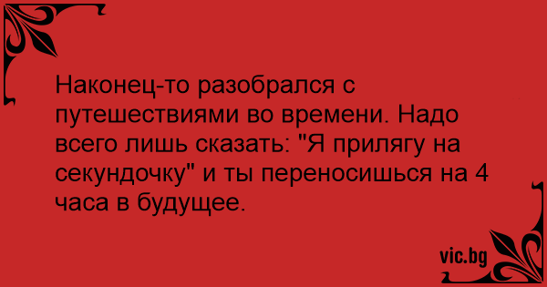 Наконец-то разобрался с путешествиями во времени. Надо всего лишь сказать: "Я прилягу на секундочку" и ты переносишься на 4 часа в будущее.