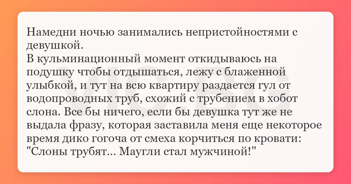 Намедни ночью занимались непристойностями с девушкой. В кульминационный момент откидываюсь на подушку чтобы отдышаться, лежу с блаженной улыбкой, и тут на всю квартиру раздается гул от водопроводных труб, схожий с трубением в хобот слона. Все бы ничего, если бы девушка тут же не выдала фразу, которая заставила меня еще некоторое время дико гогоча от смеха корчиться по кровати: "Слоны трубят… Маугли стал мужчиной!"