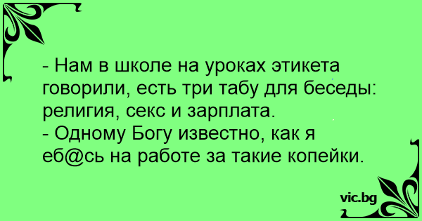 - Нам в школе на уроках этикета говорили, есть три табу для беседы: религия, cekc и зарплата.