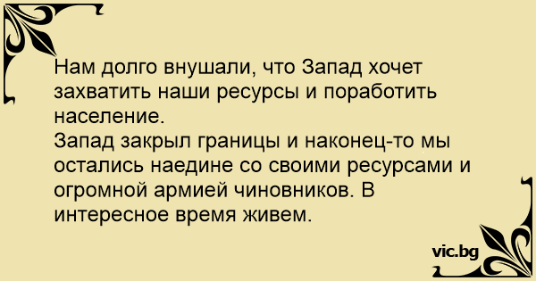 Нам долго внушали, что Запад хочет захватить наши ресурсы и поработить население.<br />Запад закрыл границы и наконец-то мы остались наедине со своими ресурсами и огромной армией чиновников. В интересное время живем.