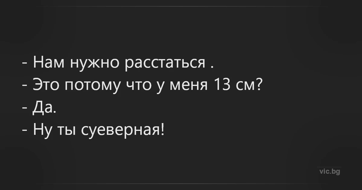 - Трябва да се разделим! - Защото ми е 13 см? - Да. - Да не би да си суеверна?! - Нам нужно расстаться .- Это потому что у меня 13 см?- Да.- Ну ты суеверная! 1 0 0