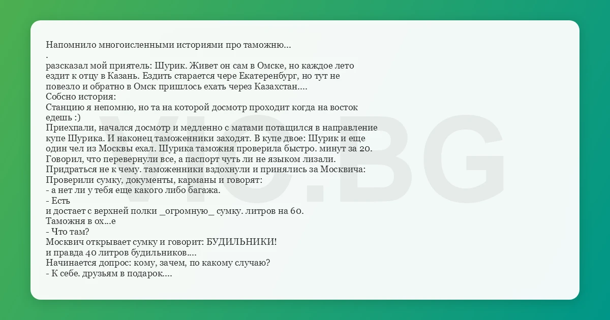 Напомнило многоисленными историями про таможню... . разсказал мой приятель: Шурик. Живет он сам в Омске, но каждое лето ездит к отцу в Казань. Ездить старается чере Екатеренбург, но тут не повезло и обратно в Омск пришлось ехать через Казахстан.... Собсно история: Станцию я непомню, но та на которой досмотр проходит когда на восток едешь :) Приехпали, начался досмотр и медленно с матами потащился в направление купе Шурика. И наконец таможенники заходят. В купе двое: Шурик и еще один чел из Москвы ехал. Шурика таможня проверила быстро. минут за 20. Говорил, что перевернули все, а паспорт чуть ли не языком лизали. Придраться не к чему. таможенники вздохнули и принялись за Москвича: Проверили сумку, документы, карманы и говорят: - а нет ли у тебя еще какого либо багажа. - Есть и достает с верхней полки _огромную_ сумку. литров на 60. Таможня в ох...е - Что там? Москвич открывает сумку и говорит: БУДИЛЬНИКИ! и правда 40 литров будильников.... Начинается допрос: кому, зачем, по какому случаю? - К себе. друзьям в подарок. - нет, ты их здесь в Казахстане продать хочешь. типа нелегальный ввоз. плати. - Нах мне их продавать, я друзьям везу. < repeat > и так раз 6 или 7. Когда в очередной раз таможня говорит, что надо бы денюшку, Москвич взрывается и с криком: за"#$%@. да нах.... мне так эти будильники выбрасывает их в окно! Таможня в шоке. - Пройдемте для выяснения - А что выяснять. Документы в порядке, багаж в порядке. - А будильники? - А фигли будильники. Не мои и все. - ааа...... А все. Поняв что попытка получить $ провалилась таможня отваливает... ЗЫ а москвич действительно вез будильники в подарок друзьям в Омск. Торгует он ими...