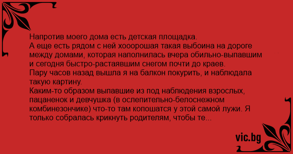 Каким-то образом выпавшие из под наблюдения взрослых, пацаненок и девчушка (в ослепительно-белоснежном комбинезончике) что-то там копошатся у этой самой лужи. Я только собралась крикнуть родителям, чтобы те обернулись, но... видно не судьба.