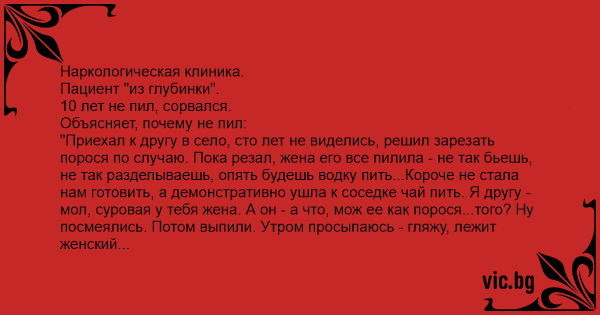 Наркологическая клиника. Пациент "из глубинки". 10 лет не пил, сорвался. Объясняет, почему не пил: "Приехал к другу в село, сто лет не виделись, решил зарезать порося по случаю. Пока резал, жена его все пилила - не так бьешь, не так разделываешь, опять будешь водку пить...Короче не стала нам готовить, а демонстративно ушла к соседке чай пить. Я другу - мол, суровая у тебя жена. А он - а что, мож ее как порося...того? Ну посмеялись. Потом выпили. Утром просыпаюсь - гляжу, лежит женский сапог - а в нем отрезанная нога, все кровью залито. Пот прошиб. А друг - ну, видишь, сказали ж - разделаем дуру - разделали...Бля...пока жена его из соседней комнаты на крик мой не выглянула - думал конец мне". Вот так друг закодировал его от пьянки. Всего-то и надо, что старые женины сапоги, да копытце от порося. ЧК
