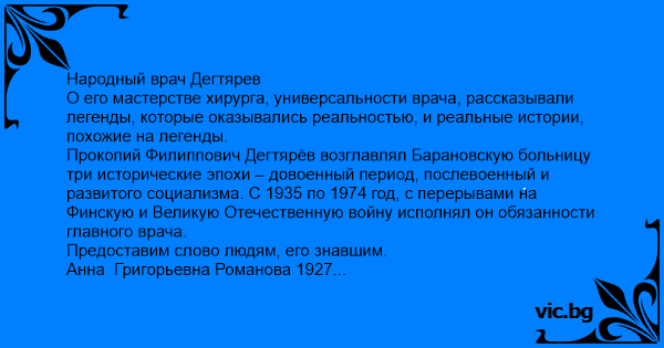 Народный врач Дегтярев О его мастерстве хирурга, универсальности врача, рассказывали легенды, которые оказывались реальностью, и реальные истории, похожие на легенды.