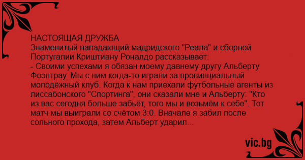 НАСТОЯЩАЯ ДРУЖБА Знаменитый нападающий мадридского "Реала" и сборной Португалии Криштиану Роналдо рассказывает: