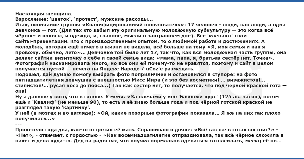 Итак, окончание группы «Квалифицированный пользователь»: 17 человек - люди, как люди, а одна девчонка — гот. (Для тех кто забыл эту оригинальную молодёжную субкультуру — это когда всё чёрное: и волосы, и одежда, и, главное, мысли о завтрашнем дне). Все 'клепают' свои сайты-презентации. Кто с производственным опытом, то о любимой работе и достижениях. А молодёжь, которая ещё ничего в жизни не видела, всё больше на тему «Я, моя семья и как я провожу, обычно, лето»... Девчонке той было лет 17, так что, как вся молодёжная часть группы, она делает сайтик-визиточку о себе и своей семье вида: «мама, папа, я, братьев-сестёр нет. Точка».