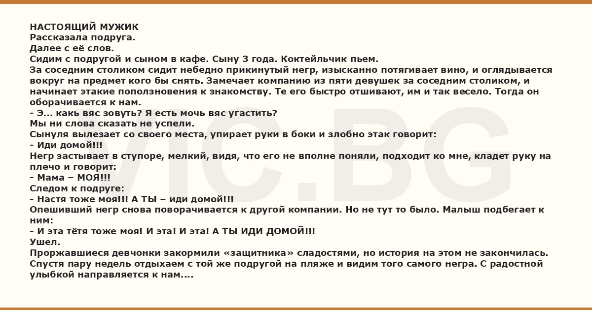 Спустя пару недель отдыхаем с той же подругой на пляже и видим того самого негра. С радостной улыбкой направляется к нам.