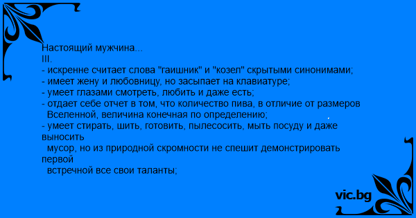 Настоящий мужчина...<br />III.<br />- искренне считает слова "гаишник" и "козел" скрытыми синонимами;<br />- имеет жену и любовницу, но засыпает на клавиатуре;<br />- умеет глазами смотреть, любить и даже есть;<br />- отдает себе отчет в том, что количество пива, в отличие от размеров<br /> Вселенной, величина конечная по определению;<br />- умеет стирать, шить, готовить, пылесосить, мыть посуду и даже выносить<br /> мусор, но из природной скромности не спешит демонстрировать первой<br /> встречной все свои таланты;<br />- не ищет повод, чтобы подарить женщине цветы, потому что считает сам<br /> факт их дарения явным поводом для дальнейших интимных событий;<br />- всегда имеет в холодильнике лед для коктейлей. Иногда только его;<br />- при посещении ресторана непременно оставляет официанту на чай с<br /> сахаром;<br />- не боится уколов, но точно знает, что целая шкура ценится выше;<br />- недопонимает почему женщину украшает легкосмываемый макияж, а мужчину<br /> трудновыводимые и болючие шрамы.<br /> ©