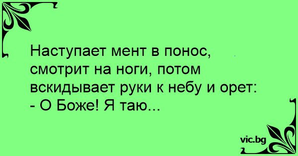 Наступає мент у пронос, дивиться на ноги, потім підкидає руки до неба і кричить: - О Боже! Я таю ...