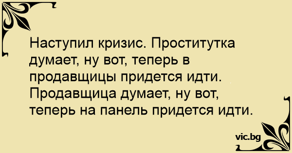 Наступил кризис. Пpoctиtуtka думает, ну вот, теперь в продавщицы придется идти. Продавщица думает, ну вот, теперь на панель придется идти.