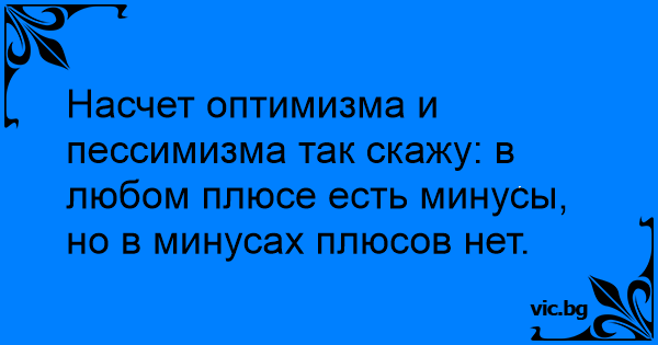 Насчет оптимизма и пессимизма так скажу: в любом плюсе есть минусы, но в минусах плюсов нет.