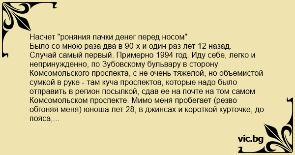 Случай самый первый. Примерно 1994 год. Иду себе, легко и непринужденно, по Зубовскому бульвару в сторону Комсомольского проспекта, с не очень тяжелой, но объемистой сумкой в руке - там куча проспектов, которые надо было отправить в регион посылкой, сдав ее на почте на том самом Комсомольском проспекте. Мимо меня пробегает (резво обгоняя меня) юноша лет 28, в джинсах и короткой курточке, до пояса, так что мне видны задние карманы его джинсов. Метрах в трех впереди от меня он лезет как раз в задний карман джинсов, вытаскивает оттуда полиэтиленовый пакетик с чем-то зеленым и роняет прямо передо мной. Мне данная мизансцена как-то сразу показалась неправдоподобной - ну вот зачем залезать на ходу себе в задний карман, где заведомо для него лежат типа доллары - И ДАЖЕ НА НИХ НЕ ПОСМОТРЕТЬ, а сразу выронить и НЕ ЗАМЕТИТЬ ЭТОГО? Это неправдоподобие мне сразу в глаза не бросилось, но, видимо, как-то на уровне подсознания я отметил, что что-то было не так.