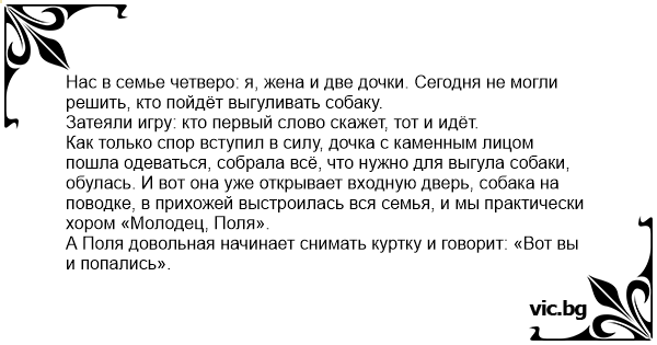 Нас в семье четверо: я, жена и две дочки. Сегодня не могли решить, кто пойдёт выгуливать собаку.