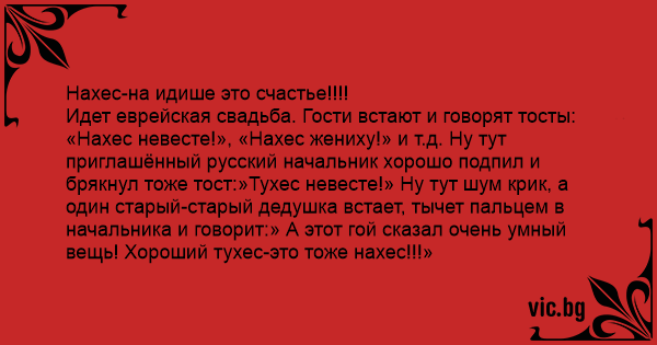 Идет еврейская свадьба. Гости встают и говорят тосты: «Нахес невесте!», «Нахес жениху!» и т.д. Ну тут приглашённый русский начальник хорошо подпил и брякнул тоже тост:»Тухес невесте!» Ну тут шум крик, а один старый-старый дедушка встает, тычет пальцем в начальника и говорит:» А этот гой сказал очень умный вещь! Хороший тухес-это тоже нахес!!!»