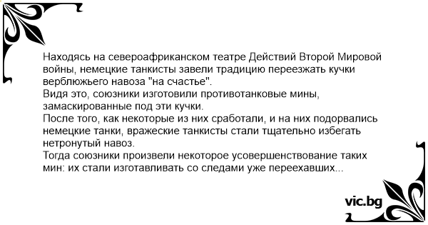 Находясь на североафриканском театре Действий Второй Мировой войны, немецкие танкисты завели традицию переезжать kучkи верблюжьего навоза "на счастье".