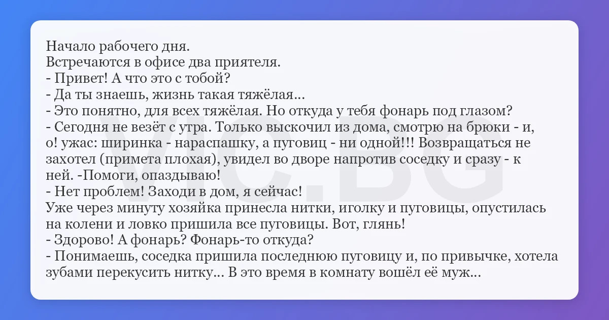 Начало рабочего дня. Встречаются в офисе два приятеля. - Привет! А что это с тобой? - Да ты знаешь, жизнь такая тяжёлая... - Это понятно, для всех тяжёлая. Но откуда у тебя фонарь под глазом? - Сегодня не везёт с утра. Только выскочил из дома, смотрю на брюки - и, о! ужас: ширинка - нараспашку, а пуговиц - ни одной!!! Возвращаться не захотел (примета плохая), увидел во дворе напротив соседку и сразу - к ней. -Помоги, опаздываю! - Нет проблем! Заходи в дом, я сейчас! Уже через минуту хозяйка принесла нитки, иголку и пуговицы, опустилась на колени и ловко пришила все пуговицы. Вот, глянь! - Здорово! А фонарь? Фонарь-то откуда? - Понимаешь, соседка пришила последнюю пуговицу и, по привычке, хотела зубами перекусить нитку... В это время в комнату вошёл её муж...