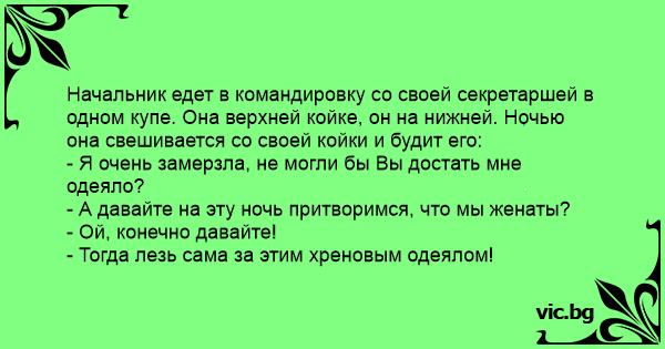 Начальник едет в командировку со своей секретаршей в одном купе. Она верхней койке, он на нижней. Ночью она свешивается со своей койки и будит его: