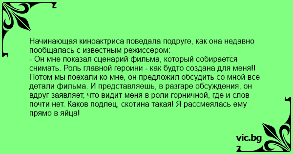 Потом мы поехали ко мне, он предложил обсудить со мной все детали фильма. И представляешь, в разгаре обсуждения, он вдруг заявляет, что видит меня в роли горничной, где и слов почти нет. Каков подлец, скотина такая! Я рассмеялась ему прямо в яйца!