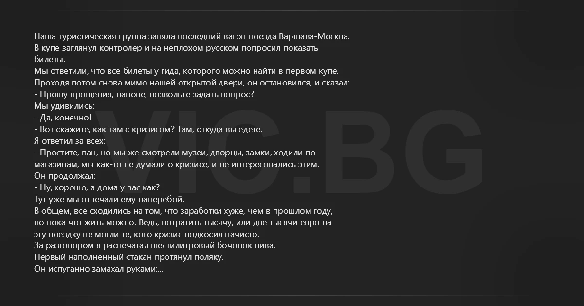 Наша туристическая группа заняла последний вагон поезда Варшава-Москва. В купе заглянул контролер и на неплохом русском попросил показать билеты. Мы ответили, что все билеты у гида, которого можно найти в первом купе. Проходя потом снова мимо нашей открытой двери, он остановился, и сказал: - Прошу прощения, панове, позвольте задать вопрос? Мы удивились: - Да, конечно! - Вот скажите, как там с кризисом? Там, откуда вы едете. Я ответил за всех: - Простите, пан, но мы же смотрели музеи, дворцы, замки, ходили по магазинам, мы как-то не думали о кризисе, и не интересовались этим. Он продолжал: - Ну, хорошо, а дома у вас как? Тут уже мы отвечали ему наперебой. В общем, все сходились на том, что заработки хуже, чем в прошлом году, но пока что жить можно. Ведь, потратить тысячу, или две тысячи евро на эту поездку не могли те, кого кризис подкосил начисто. За разговором я распечатал шестилитровый бочонок пива. Первый наполненный стакан протянул поляку. Он испуганно замахал руками: - Нет-нет, пан! Бардзо дзенькую, но не можно! Никак не можно! Мы не поняли: - Почему?! Уже вечер, ты проверил весь поезд, можешь отдыхать! А в ответ услышали: - Нет-нет! Вы не понимаете! Русские очень гостевы! Пройдешь по вагону и будешь вот так, - он руками показал – на рогах! Все-таки, выпить один-то бокальчик мы его убедили, но сразу после этого он ушел из нашего вагона, больше ни с кем не заговаривая! А после его ухода, мы выпили за то, чтоб русские всегда были «гостевы»!